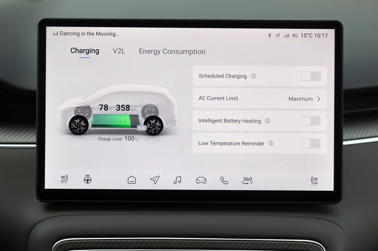On trouve une console centrale surélevée et légèrement courbée entre les deux passagers. La platine apparue avec le S5 EV et qui pilote le chauffage est reprise, et la console reçoit une commande de marche rotative ainsi qu’un chargeur induction de 50 W et ventilé. Bien creusé et habillé d’une feutrine, il tient correctement les téléphones en place dans les virages. À noter que ces derniers peuvent être connectés sans fil à Apple CarPlay ou Android Auto.