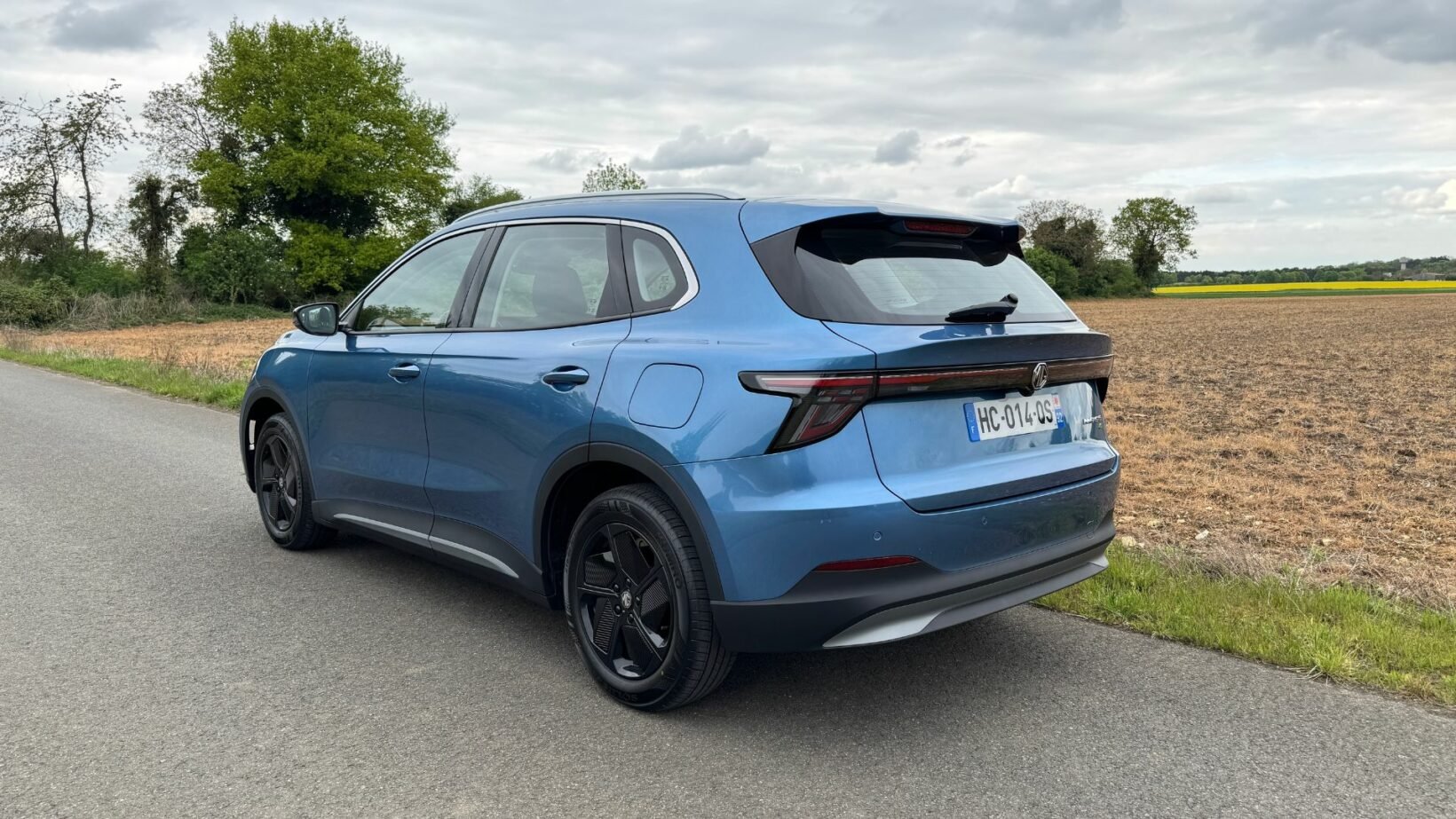 Dès la finition Comfort, l’équipement du MGS5 EV s’avère complet : jantes 17 pouces aux enjoliveurs discrets, phares à LED, barres de toit habillent élégamment la carrosserie. Seule la peinture métallisée est facturée en option 650 €. La qualité de fabrication est tout fait correcte avec des panneaux de carrosserie bien ajustés, des joints épais et une peinture bien appliquée. Le style fluide mais sans personnalité privilégie l’aérodynamique à l’élégance ou l’originalité.
