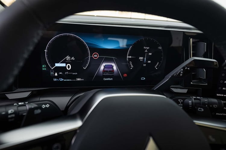 En revanche, les évolutions sont inexistantes à bord, avec un habitacle parfaitement identique au Scenic. Ce qui n’est pas un mauvais choix tant le SUV au Losange séduit par sa présentation, ses matériaux et son niveau de finition. C’est notamment le cas à l’avant avec la présence de poste de conduite OpenR Link, reconnaissable à ses deux écrans numériques. Si l’instrumentation affiche des graphiques spécifiques, la dalle centrale conserve l’organisation et les affichages du Scenic. On retrouve donc le système d’exploitation Android Automotive qui ne prête toujours pas le flanc à la critique. Il fait toujours figure de référence, surtout grâce à son planificateur d’itinéraire via Google Maps, relativement précis et pertinent dans les prédictions de recharge.