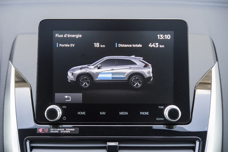 Le 2,4 litres à cycle Atkinson se fait en revanche plus sonore lors des forts appels de puissance. Ainsi en poussant la pédale de droite au plancher, en sortant d’un rond-point par exemple. Un court instant, l’Eclipse Cross commence à accélérer en mode électrique seul. Puis le moteur essence entre dans la danse, avec une puissance qui tourne autour des 50 kW. Là, la mécanique se fait entendre, mais de façon feutrée, vraiment sans désagrément.