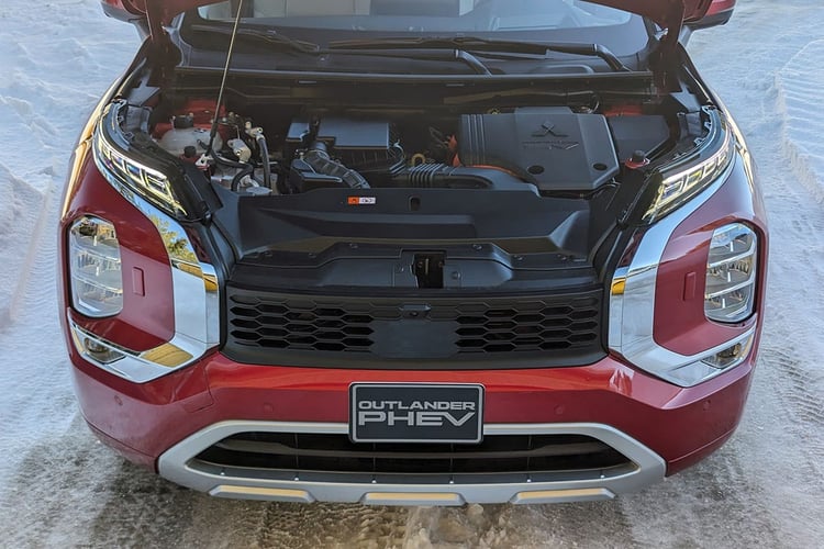 Bien qu’il repose sur la plateforme CMF-C/D commune, l’Outlander fait le choix d’une mécanique bien différente cumulant, pour schématiser, les principes de fonctionnement des moteurs hybride-série du Nissan et hybride-parallèle du Renault. On retrouve au sein de cette chaîne de traction un moteur thermique 2,4 l atmosphérique à cycle Atkinson (code 4B12) de 133 ch pour 195 Nm de couple. Il est associé à une paire de machines électriques, l’une de 116 ch/255 Nm à l’avant, l’autre de 136 ch/195 Nm à l’arrière. C’est cette dernière qui offre au SUV le statut de transmission intégrale, puisqu’il ne dispose pas d’arbre de transmission mécanique. La puissance cumulée grimpe à 248 ch pour 332 Nm.