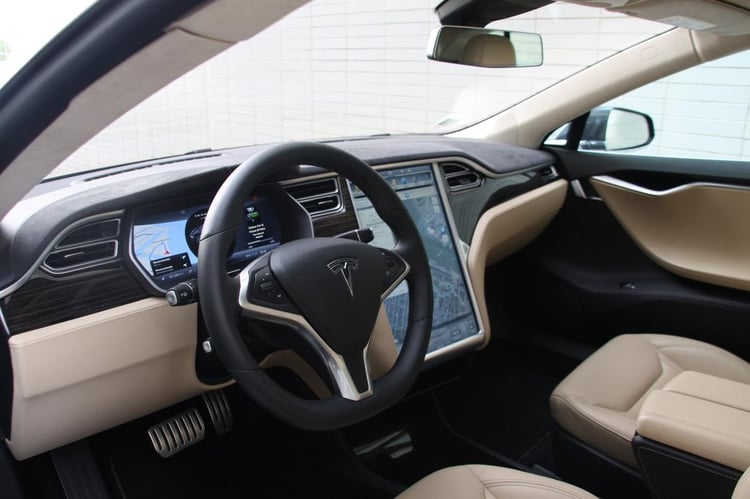 A l’intérieur, on « bloque » littéralement devant le large écran 17 pouces de la Model S qui ferait passer l’iPad pour un vulgaire timbre-poste et qui fait office de véritable ordinateur de bord. Particulièrement bien pensé, le système est à la fois fluide et ergonomique et n’est pas sans rappeler celui de l’iPhone. Tout est intuitif. Pour ouvrir le toit ouvrant, il suffit de glisser le doigt sur l’écran. De manière générale, tout est paramétrable via cet écran : on peut ainsi configurer le niveau du frein régénératif et même enregistrer différents profils de conducteurs qui gardent en mémoire les réglages du siège.