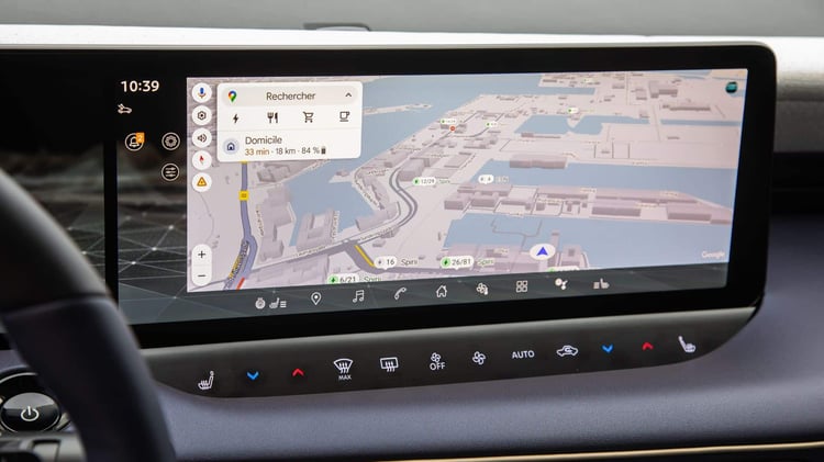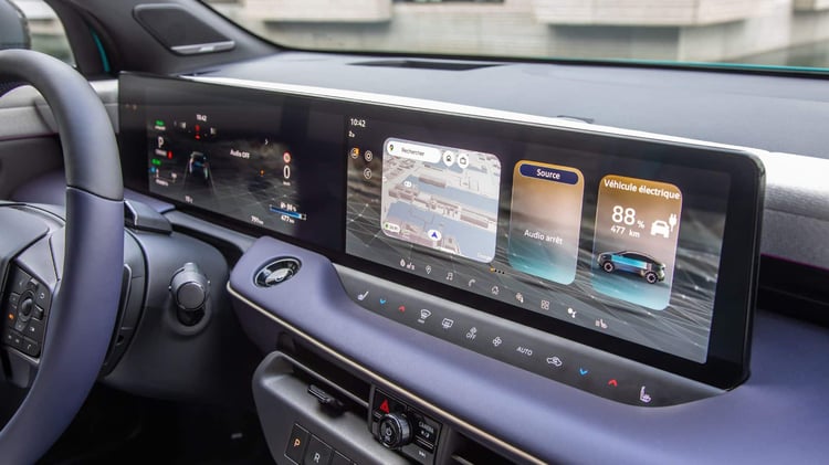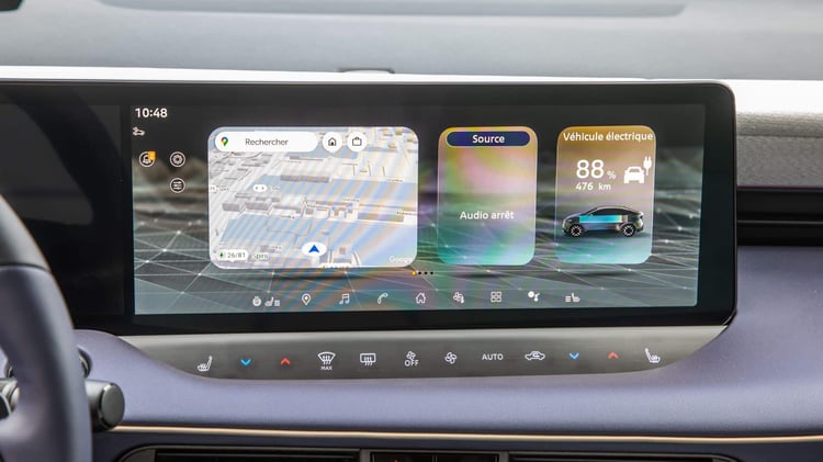 L’habitacle impressionne par son double écran de 14,3 pouces disponible dès la finition Engage +. L’affichage tête haute apparaît à partir du niveau Advance, et la connectivité s’appuie désormais sur tout l’écosystème Google : planificateur d’itinéraire, commande vocale, services intégrés, sans oublier les applications Spotify, Deezer, YouTube ou même Waze projeté directement dans le champ de vision. Le processeur Snapdragon garantit une fluidité exemplaire et permet même de faire tourner des jeux en 3D.