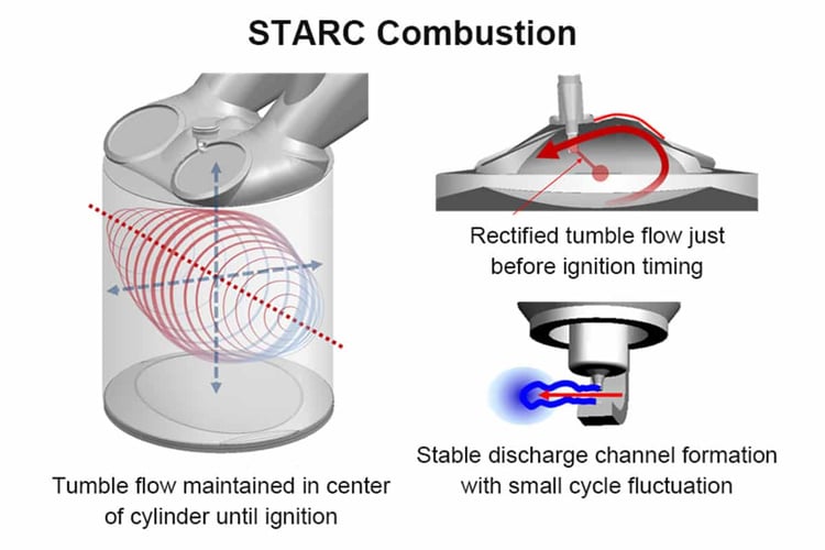 Essai – MG ZS Hybrid+ : que vaut le moins cher des SUV compacts hybrides ?D’autre part, le bloc thermique évolue en profondeur. Cubant toujours 1,5 l et alimenté par un (plus gros) turbo, il adopte la technologie de combustion STARC de la marque. Pour schématiser, ce principe permet de créer un tourbillon dans la chambre de combustion en maintenant la soupape d’admission ouverte, puis de maîtriser la turbulence afin d’obtenir un allumage plus stable, améliorant le rendement de la combustion. Cette solution n’est possible qu’avec un moteur qui a un rôle de générateur, puisqu’elle profite de l’absence des turbulences causées par les régimes variables. Avec ce moteur, Nissan vise un rendement thermodynamique absolument record de 50 %. Mais, en l’état actuel de la technologie, le rendement est de 42 %, soit tout de même l’un des meilleurs de la production actuelle.