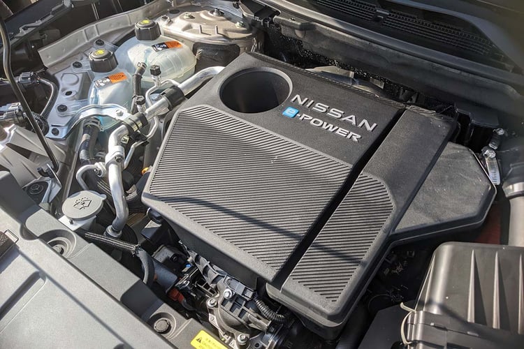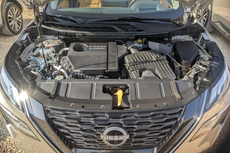 Essai Nissan Qashqai e-Power : crise existentielleDans cette configuration, le Nissan X-Trail s’équipe de blocs de 204 ch (150 kW) et de 136 ch (100 kW) positionnés respectivement à l’avant et à l’arrière, pour une puissance combinée de 213 ch (157 kW). Comme d’habitude, ce sont les seuls qui s’occupent de faire tourner les roues. Ils sont alimentés par une batterie de 1,73 kWh de capacité utile, qui produit désormais 66 kW contre 60 kW dans le Nissan Qashqai. Elle est donc un peu plus puissante pour satisfaire les besoins des deux moteurs, mais la capacité utile est à peine plus réduite pour laisser plus de marge au système. Rien qui ne change fondamentalement le fonctionnement puisque le système lance toujours le générateur à essence pour recharger la batterie aux alentours des 25 % de charge restante.