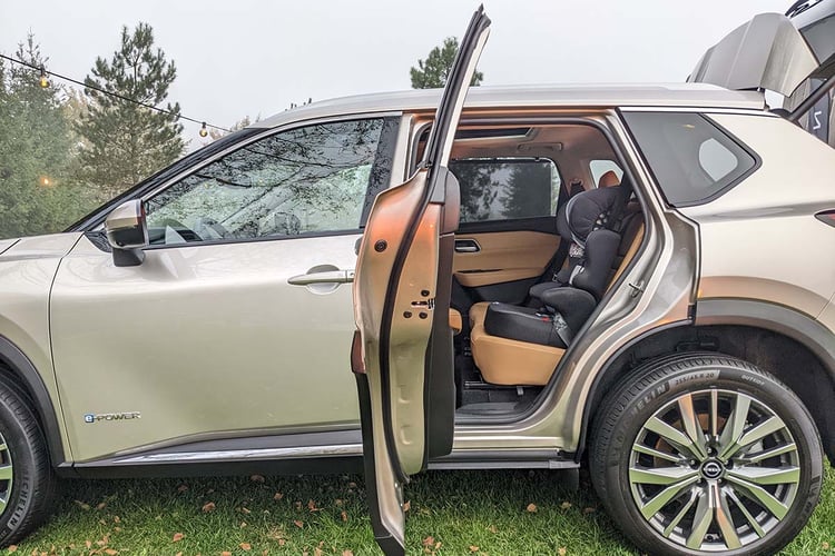 Si la présentation diffère du Qashqai, le X-Trail présente un habitacle assez similaire. C’est notamment le cas de la partie haute de la planche de bord, quasi identique à celle du SUV compact. On y retrouve l’instrumentation numérique et la dalle tactile centrale de 12,3 pouces chacune, mais aussi des touches et une commande de « boîte » communes. L’agencement est toutefois revu sur la haute console centrale, qui libère un généreux rangement entre les sièges. On apprécie également les portes arrière avec une grande ouverture à 85°, qui facilitent grandement l’installation d’un enfant sur un siège-bébé ou l’accès aux places arrière.