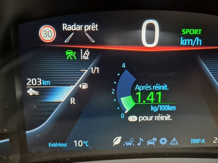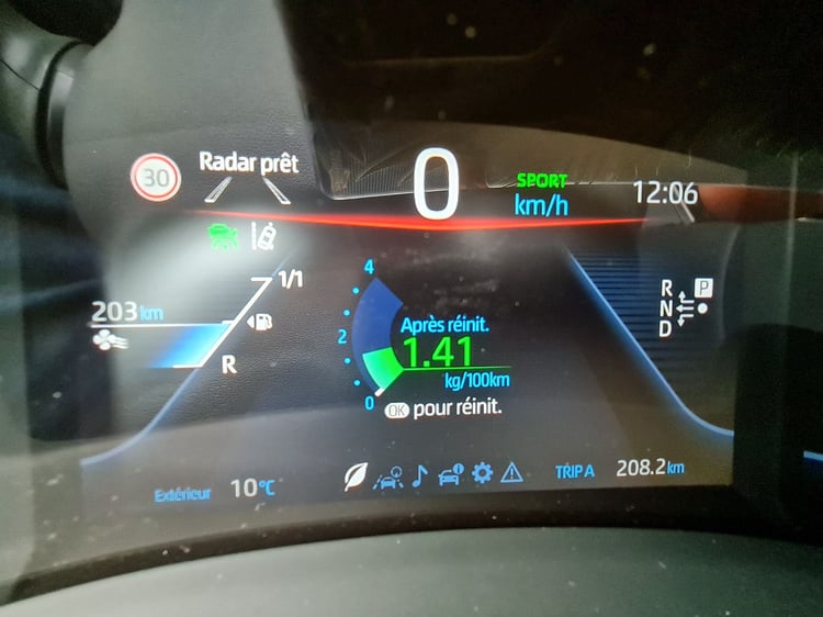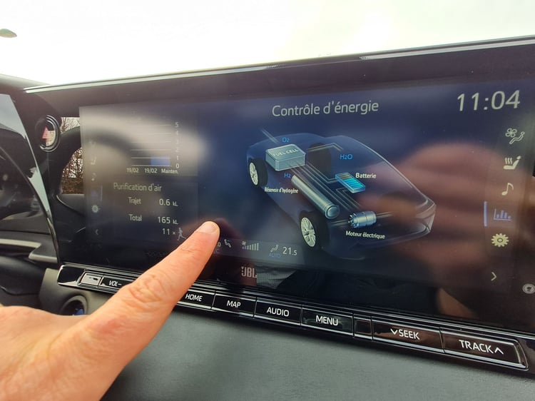 Au terme de notre boucle de 208,2 km au nord de Paris, la nouvelle Mirai affiche une consommation moyenne de 1,41 kg/100 km. C’est naturellement supérieur aux 0,80 (Mirai lounge) et 0,89 (Mirai executive) kg/100 km annoncés en cycle mixte WLTP. Malgré un léger gain de sobriété sur l’ancienne génération, la berline reste un peu plus gourmande que son principal concurrent : le Hyundai Nexo. Lors d’un test autoroutier, nous avions relevé une consommation de 1,2 kg/100 km à bord du SUV coréen à hydrogène.