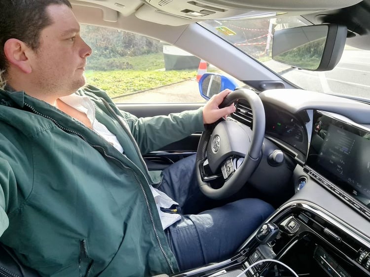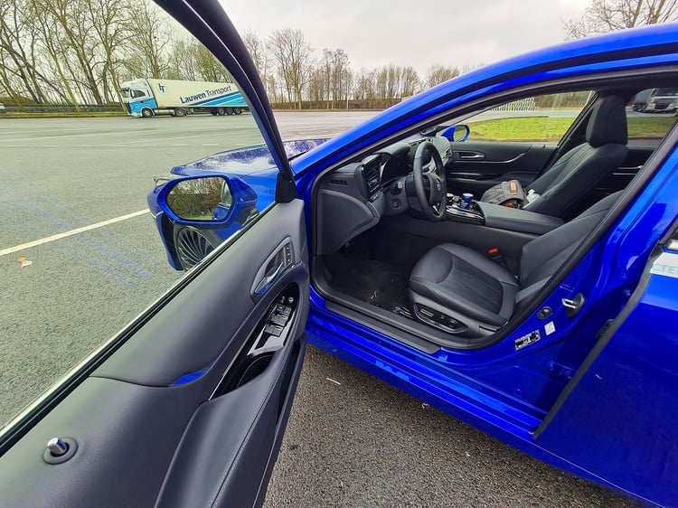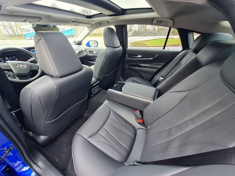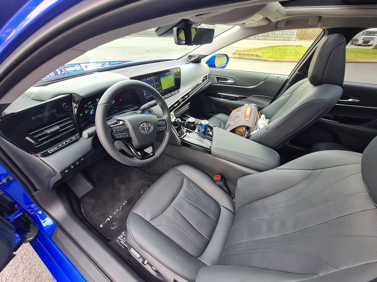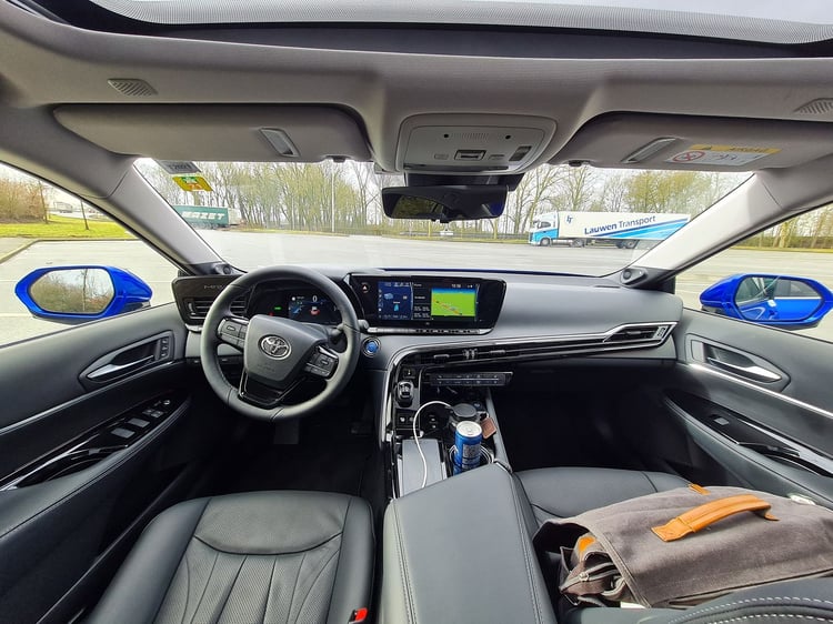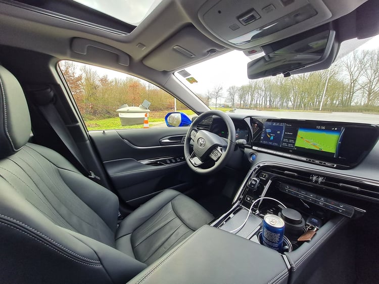 Malgré ces ajustements, la berline prend un peu d’embonpoint. Elle affiche 1 900 kg sur la balance, soit 50 kg de plus que l’ancienne Mirai. Un léger surpoids qui s’explique notamment par le gabarit du véhicule. Il gagne 85 mm en longueur (4,97 m) et 70 mm en largeur (1,88 m), mais perd 55 mm en hauteur (1,48 m). Si la fiche technique a bien évolué, qu’apporte-t-elle concrètement sur la route ? Nous avons testé la nouvelle Toyota Mirai sur une boucle exclusivement autoroutière de 208 km. La première impression à bord est celle que l’on pourrait avoir en pénétrant dans un taxi flambant neuf. Logique, la berline a été totalement conçue pour satisfaire sa clientèle cible : les compagnies de taxis/VTC et grandes entreprises.