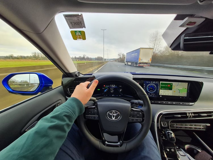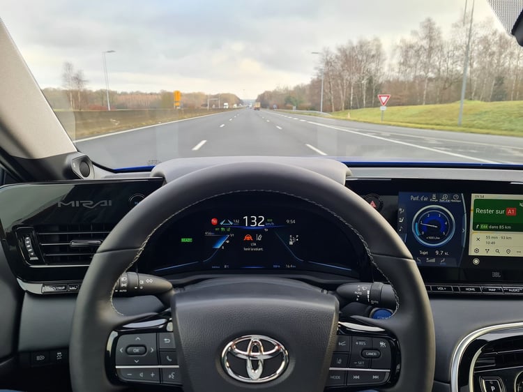 La nouvelle Mirai est équipée d’aides à la conduite telles qu’un régulateur de vitesse adaptatif et un assistant au maintien dans la voie. Ces deux outils, que nous utilisons sur la quasi-totalité de l’essai, sont très aboutis. La berline reste parfaitement alignée dans sa voie et détecte assez tôt la présence de véhicules pour adapter sa vitesse. Le jour de notre test, l’autoroute est clairsemée, ce qui nous permet de maintenir une vitesse constante de 130 km/h. La jauge à carburant s’infléchit lentement malgré l’allure soutenue.