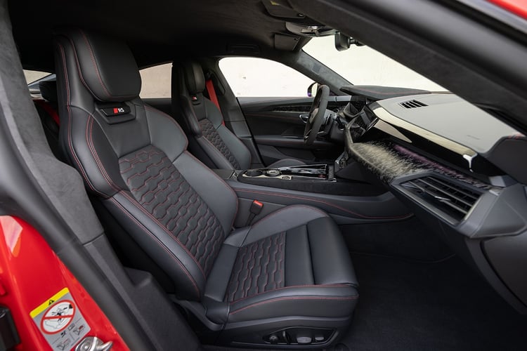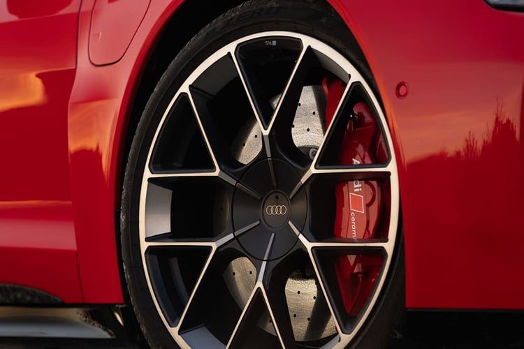 La berline sportive reçoit aussi un nouveau dispositif de freinage récupératif via ses machines électriques, pouvant grimper jusqu’à 400 kW de puissance de régénération. Mais il faut pour cela saisir le système de freinage dissipatif, puisque les modes de récupération se révèlent toujours légers en matière de force de décélération. D’office, la RS e-Tron GT Performance adopte des disques traités au carbure de tungstène de 410 et 365 mm, respectivement pincés par des étriers à dix et quatre pistons. Elle peut recevoir en option (7 000 €) le système carbone-céramique, avec des disques de 420 et 410 mm.