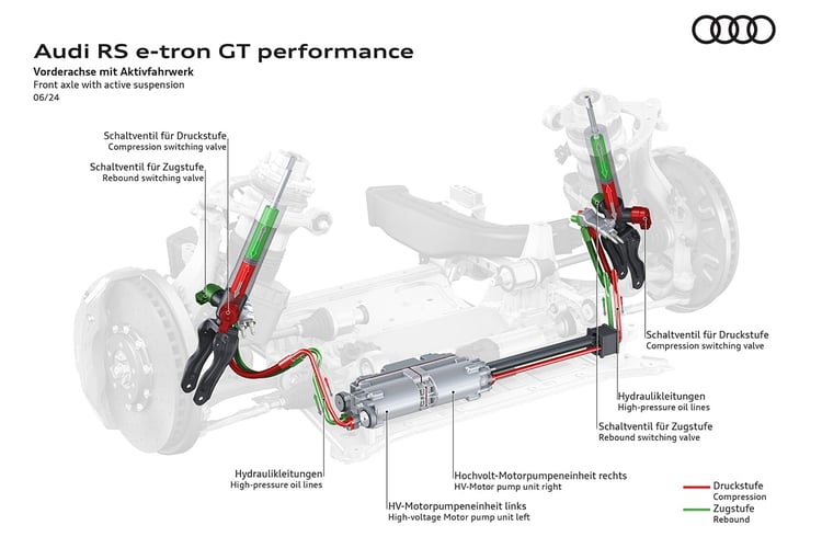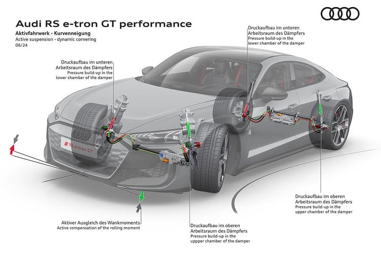 Les technologies électriques facilitent la fabrication de voitures rapides. Mais l’Audi RS e-Tron GT RS n’est pas qu’une grosse armoire électrique à faire rougir de plaisir un électricien. Reposant toujours sur la même plateforme partagée avec la Taycan, elle en récupère aussi les dernières trouvailles techniques. À commencer par la suspension active confiée à des amortisseurs hydrauliques à deux chambres et deux valves. Piloté par des pompes branchées sur le réseau haute tension, le dispositif veut défier les lois de la physique en compensant les mouvements de caisse. En longitudinal (accélération et freinage), la voiture fait tout pour garder la voiture à l’horizontal. Dans les virages, elle penche à l’intérieur de la courbe pour annihiler le roulis.