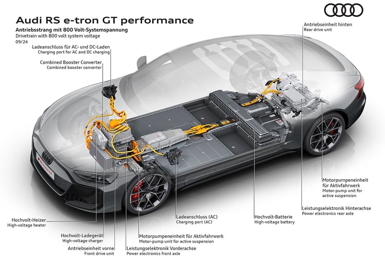 Essai – Porsche Taycan Turbo GT Pack Weissach : au volant du monstre électrique du NürburgringSi l’Audi Q6 e-Tron Performance désigne l’une des versions les moins puissantes de la gamme du SUV, le badge est beaucoup plus représentatif avec l’Audi RS e-Tron GT. Il s’agit de la version surpuissante de la berline sportive, qui ne manque déjà pas de souffle dans sa version S e-Tron GT d’entrée de gamme. Cette déclinaison promet une écurie maximale de 925 ch (680 kW) pour 1 027 Nm de couple, ce qui fait d’elle l’Audi de série la plus puissante de l’histoire. Mais calmons-nous deux minutes, car il convient de lire entre les lignes.