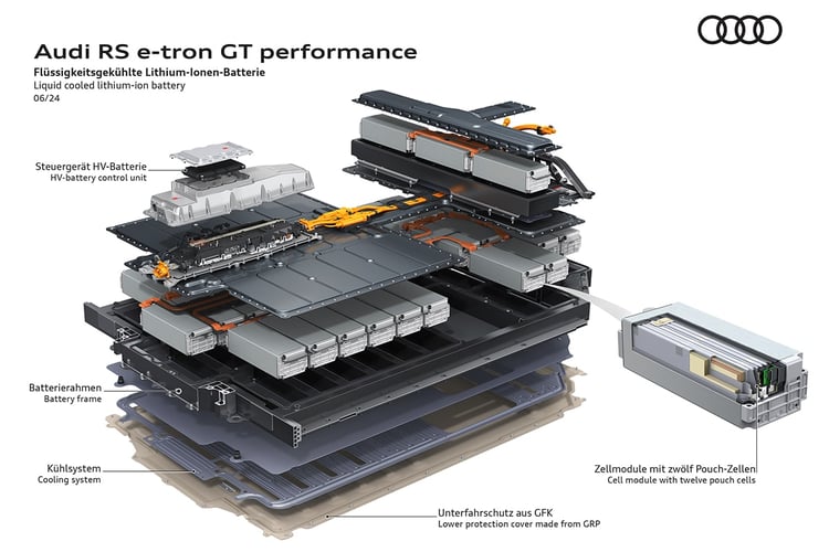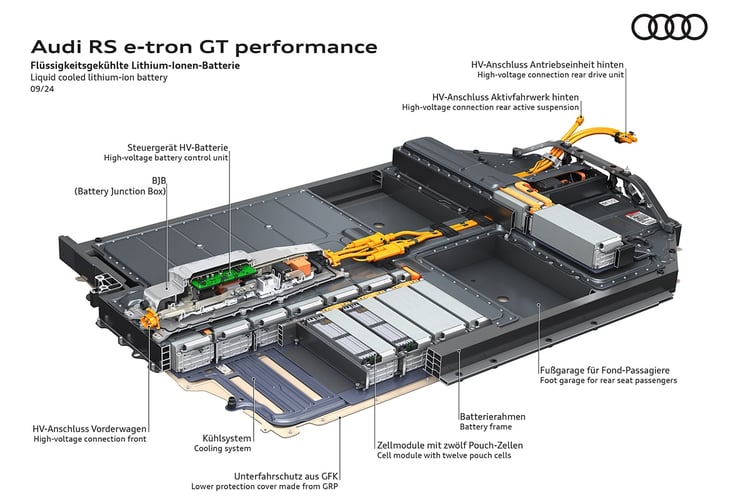 La mécanique est alimentée par la nouvelle batterie de 97 kWh de capacité nette. Celle-ci est composée d’inédites cellules poches fournies par LG Chem (sans doute des E72b), qui reposent sur la chimie NMC811 (au lieu de NMC721). Elles sont branchées selon le principe 198s2p, pour une tension nominale réelle de 726 V, et réparties en 33 modules. Avec le mode Launch Control, elle est capable de produire un maximum de 1 100 A.