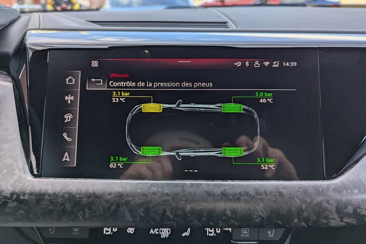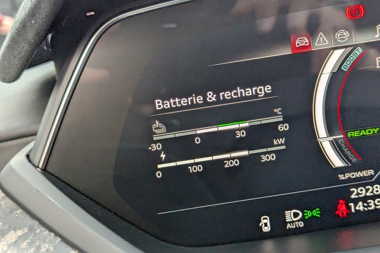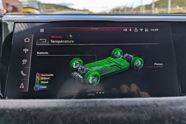 Bien que pensée pour la piste, d’aucuns diront que rares seront les convois d’Audi RS e-Tron GT Performance à aller limier les circuits. Cela étant, la voiture s’est montrée suffisamment à l’aise lors de cette rapide demi-journée d’essai sur la piste du Pôle Mécanique d’Ales, avec une température extérieure gravitant autour de 13 °C. Les nouvelles batterie et machines électriques, au refroidissement amélioré, se sont montrées suffisamment endurantes pour l’usage qui en a été fait. Si la montée en température de la batterie est rapide, la régulation thermique n’a jamais flanché. Nous n’avons jamais vu la batterie dépasser la barre des 40/45 °C. Voilà qui laisse de la marge, cette batterie s’autorisant au moins jusqu’à 55 °C lors d’une recharge par exemple.