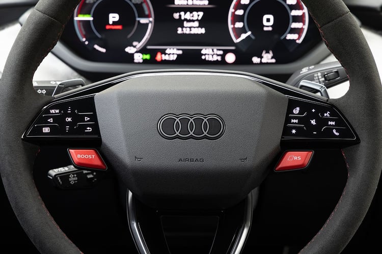 Il s’agit ici d’un ultime et bref pic de puissance, disponible pendant dix secondes en activant le mode Launch Control du mode Performance. Le reste du temps, l’e-Tron GT Performance compte sur 748 ch (550 kW). Cependant, la fonction Push-to-Pass accessible via la touche Boost sur le volant offre jusqu’à 843 ch (620 kW), là encore pendant dix secondes. Mais il faut pour cela rouler à plus de 30 km/h et disposer de plus de 50 % de batterie. Voilà qui semble signifier que cette dernière n’est plus capable de délivrer l’intensité nécessaire sous ce taux de charge. La berline sportive dispose donc de trois niveaux de puissance différents, tous exprimés en pic. Ce qui fait beaucoup de pics. On pourrait presque chanter une comptine. Bref, l’Audi RS e-Tron GT Performance est certes l’Audi la plus puissante de l’histoire, mais elle ne l’est que pendant dix secondes… Enfin, notons que la puissance nette maximale homologuée s’établit à 222 ch (163 kW).