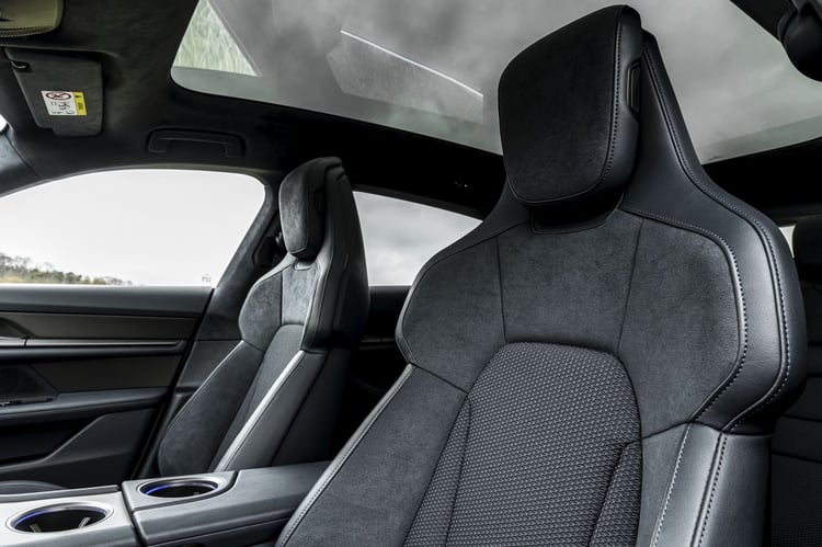 À l’avant, on retrouve sans surprise la même planche de bord que la berline classique. Notre modèle d’essai bénéficie de l’option cuir intégral et d’une sellerie mêlant cuir, alcantara avec de multiples réglages électriques. Légèrement incurvé, l’écran d’instrumentation est complété par deux écrans tactiles. Le premier sert aux réglages du système multimédia tandis que le second, en position verticale, permet de gérer la batterie et la climatisation. Optionnel, un autre écran peut être ajouté pour le passager.