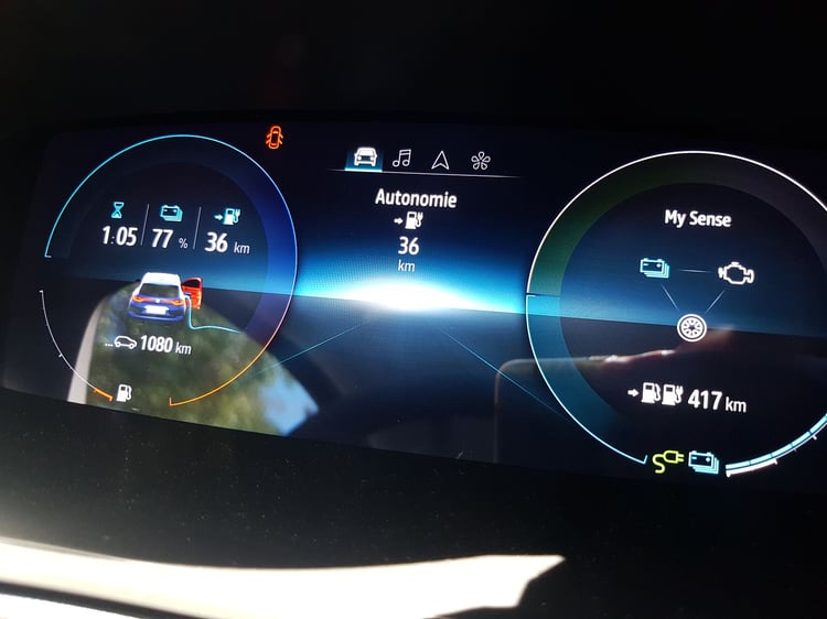 Au terme de notre essai, la consommation moyenne s’élève à 2,4 l/100 km (essence) et 11,1 kWh/100 km (électricité). Elle est naturellement plus élevée que les 1,3 l/100 km promis par le cycle mixte WLTP en raison de notre excursion à haute vitesse sur autoroute et de la distance parcourue. Le chiffre reste toutefois très intéressant, loin des 6 à 7 l/100 km qu’aurait affiché une Megane essence Tce 140 ch sur un itinéraire similaire. L’autonomie électrique annoncée à 50 km paraît largement faisable à condition de ne pas s’aventurer sur voies rapides et de conduire normalement, sans nervosité.