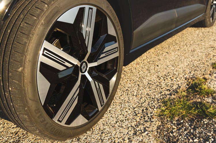 Sur le modèle des dernières Clio V et Captur 2, les flancs sont travaillés en finesse. Les poignées deviennent affleurantes, une première chez Renault, tandis que la poupe se distingue par des optiques très effilées et travaillées, à effet 3D, mais aussi des rappels des imposants inserts du bouclier avant (dorés en finition haute Iconic ou couleur carrosserie).
