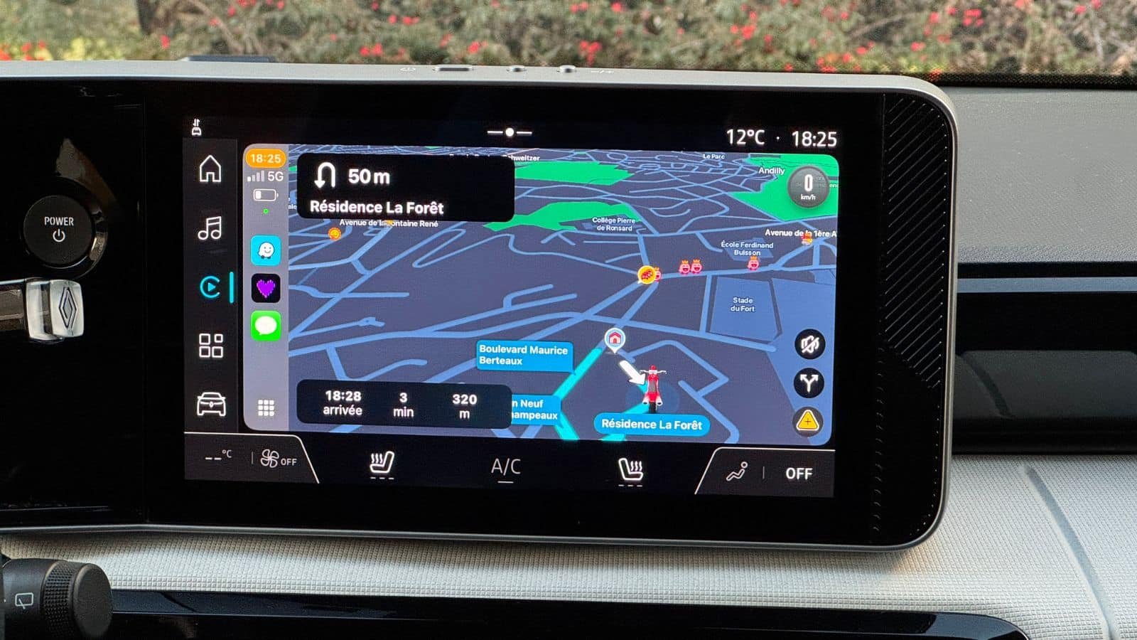 L’instrumentation de la Renault R5 Évolution se limite à un écran de 7 pouces, contre 10 pouces sur la Techno. L’écran central de 10,1 pouces est compatible avec Apple CarPlay et Android Auto sans connexion filaire, ce qui fait oublier l’absence de GPS et de planificateur d’itinéraire.