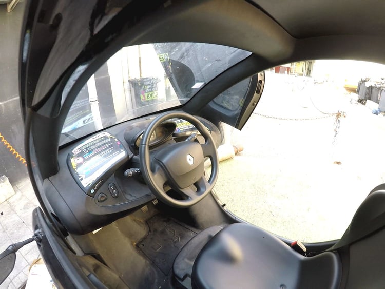 Un avantage qui équilibre un peu la longue liste des inconvénients du quadricycle. Le modèle que nous utilisons est équipé de portières papillons, disponibles uniquement en option à 590 euros. Il n’a pas de fenêtres, elles aussi en option à 345 euros. Un problème lors d’intempéries, qui peut rendre le Twizy très inconfortable à utiliser. Il n’est pas rare d’en trouver remplis d’eau, de feuilles mortes et d’ordures lorsqu’ils sont garés sur la voirie.