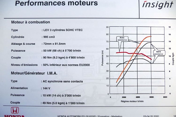 Le troisième axe de développement de l’Insight concerne donc la mécanique. Sous le capot prend place un 3-cylindres en aluminium de 995 cm³, d’une puissance maximale de 68 ch (à 5 700 tr/min) pour 90 Nm de couple. Ce bloc ECA1 uniquement pensé pour l’Insight est dit à combustion pauvre (plus d’air que d’essence). Il reprend aussi la plupart des technologies développées par Honda, à l’image du système VTEC intégré dans les rouleaux des culbuteurs (comme sur la S2000), la distribution par chaîne ou l’axe du vilebrequin décalé de 14 mm par rapport à l’axe des cylindres. On y trouvait aussi une distribution d’allumage spécifique, une pompe à essence à régime variable et même des bougies triées en usine afin de permettre aux électrodes d’être spécifiquement orientées dans les cylindres ! Du côté de ces derniers, justement, la lubrification devait être assurée par une huile 0W20 pour réduire au maximum les frottements.