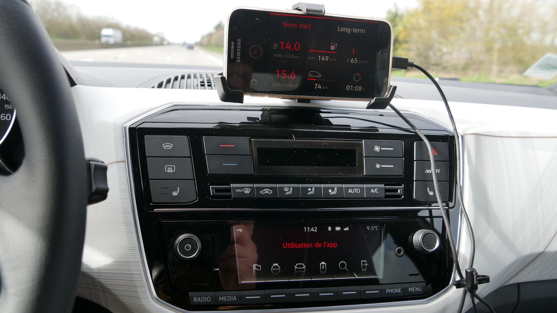 En connectant son téléphone au véhicule via un port USB, le constructeur propose en effet de répéter les informations déjà affichées sur le tableau de bord. Une application dont l’utilité est limitée d’autant qu’elle présente de nombreux bugs (écran figé, navigation lente, ergonomie catastrophique et absence de données importantes). Dommage, l’idée d’exploiter le téléphone de l’utilisateur comme écran d’infodivertissement était pourtant pertinente. Le support solidaire de la planche de bord reste de bonne qualité, l’appareil est correctement maintenu. Il permet au moins de jeter facilement un œil sur le GPS.