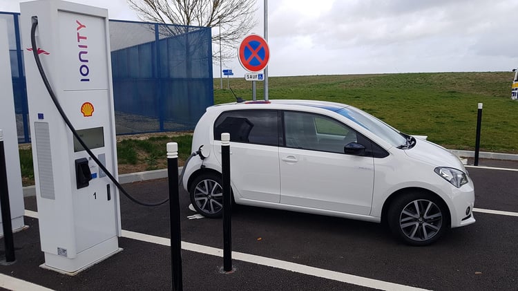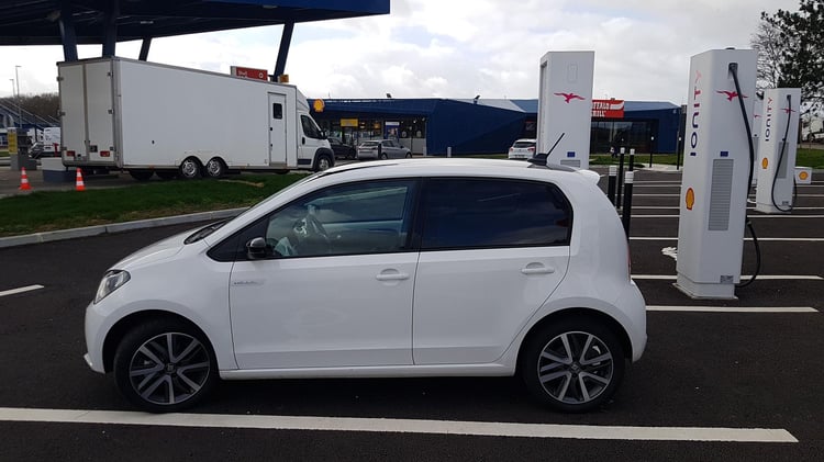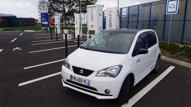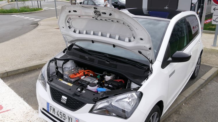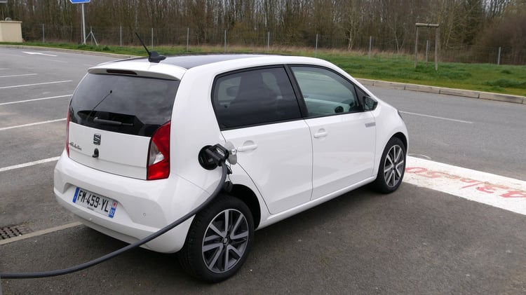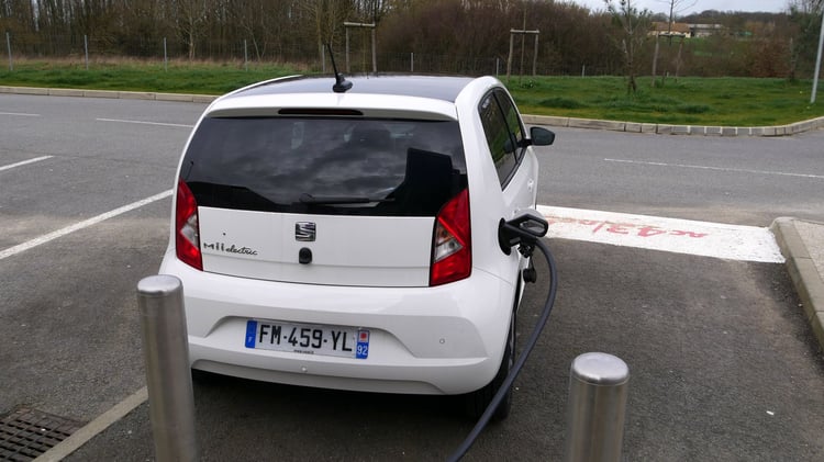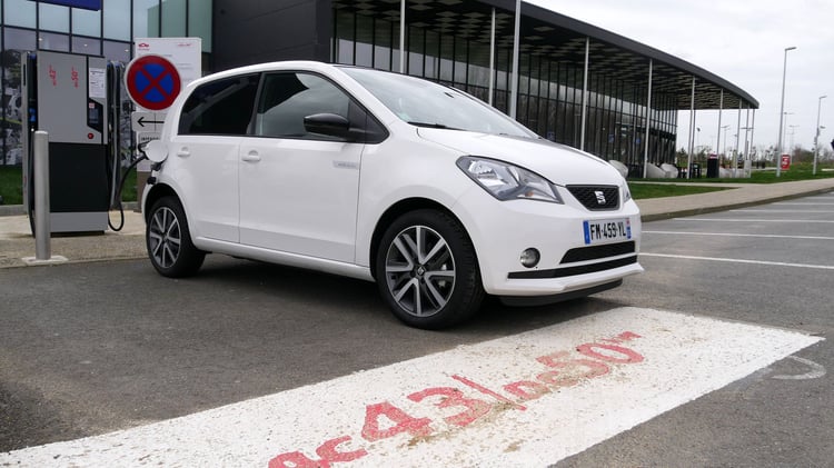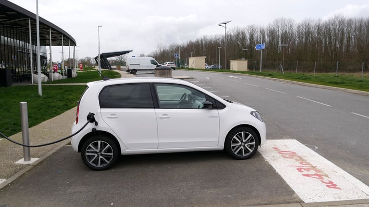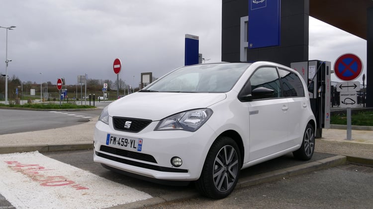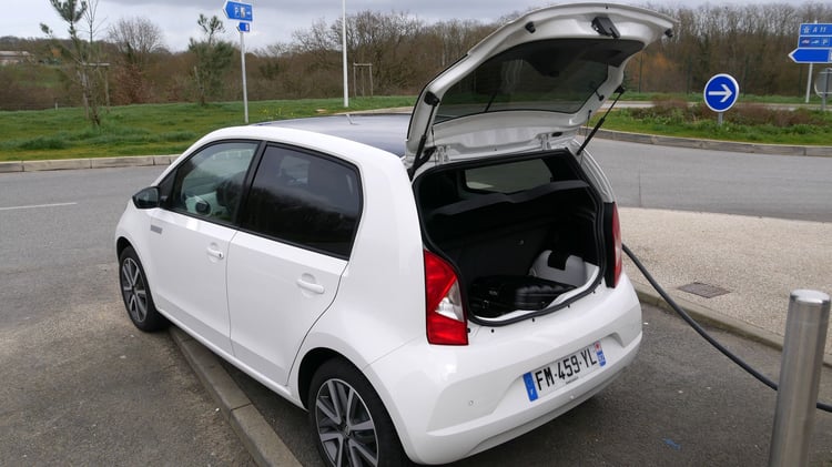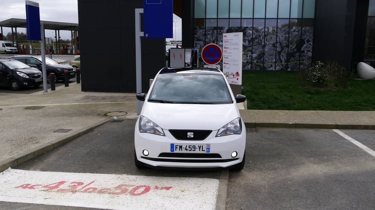 A mi-chemin, nous marquons l’arrêt sur l’aire de Sargé-Les-le-Mans pour recharger sur une station du réseau Total EV Charge. Après 113 km parcourus (195 km depuis Paris), il reste environ 25 % de batterie et 57 km d’autonomie selon le tableau de bord. Nous branchons la Mii sur l’unique borne EVBox. Après 1h07 de charge jusqu’à 85 %, la puissance moyenne n’est toujours pas satisfaisante. Elle s’élève à 19,3 kW soit deux fois moins qu’annoncé. Les 21,7 kWh récupérés nous sont facturés 8,47 euros via le Chargemap Pass, un tarif bien plus raisonnable que le réseau Ionity.