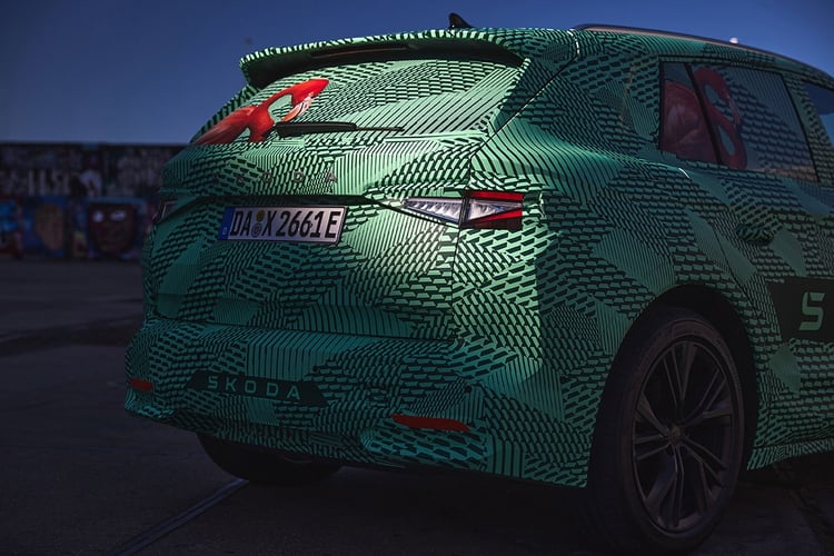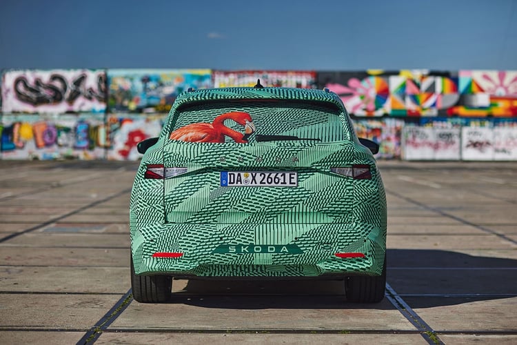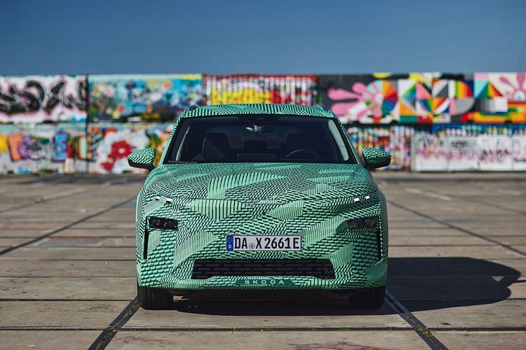 Entièrement cachées derrière les stickers, difficile d’apprécier les lignes du SUV, qui inaugure la signature Modern Solid apparue avec le Vision 7S. Celle-ci se caractérise par un capot doté d’un badge en toutes lettres, d’une calandre pleine plus mince et des feux diurnes minimalistes. On remarque toutefois un second bloc optique situé plus bas, qui lui disposera de la technologie Matrix LED à 36 segments. À l’arrière, l’Elroq n’est plus que jamais qu’un petit Enyaq avec le dessin des optiques.