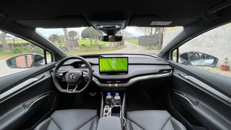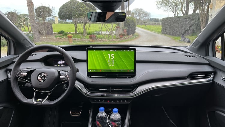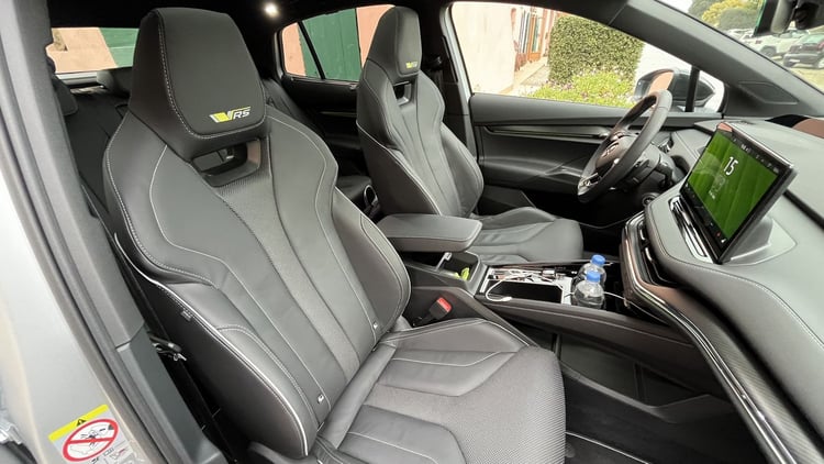Face au conducteur, la présentation de la planche de bord est similaire à celle qui équipe le Skoda Enyaq classique. Les matériaux rembourrés sont omniprésents à bord, y compris sur le haut des panneaux des portes et les accoudoirs. « C’est mieux fini qu’un Volkswagen GTX », apprécie Maxime Fontanier.