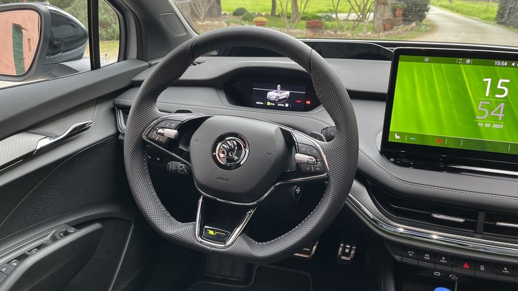 L’engin de la marque tchèque est en revanche mieux conçu pour régler la puissance de la décélération régénérative. En plus du mode B (Brake), elle s’appuie sur un jeu de palettes derrière le volant. À faible allure, et sur chaussée dégradée, les passagers apprécieront le travail de la suspension. Peut-être un peu moins les bruits qu’elle fait remonter à bord, en particulier du fait des grandes jantes qui équipent le modèle à notre disposition.