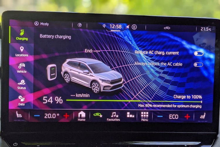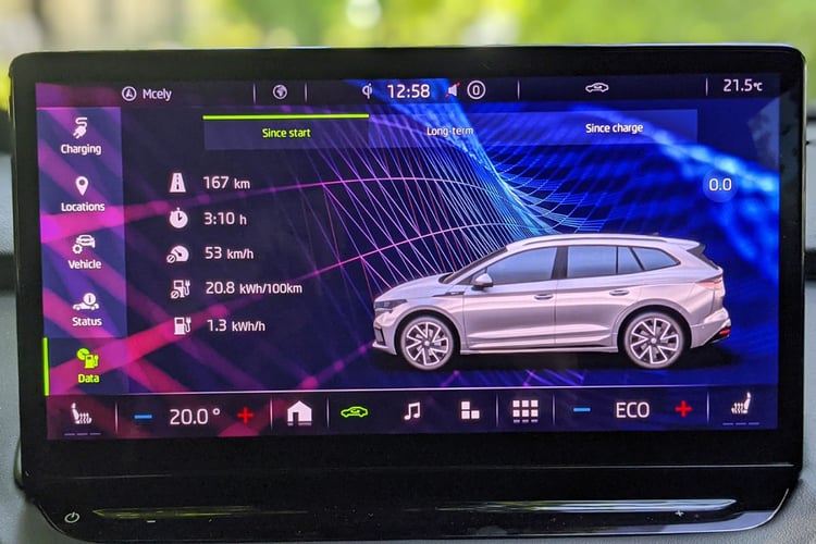 Au terme d’un parcours de 167 km (à la vitesse moyenne de 53 km/h), nous avons enregistré une moyenne de 20,8 kWh/100 km précisément. Ce qui, avec une batterie de 77 kWh de capacité nette, offre une autonomie théorique de 370 km. En l’absence de nos mesures de reprises toujours énergivores, la barre des 400 km serait à la portée de l’Enyaq. C’est 100 km de moins par rapport à la valeur WLTP communiquée par Skoda.