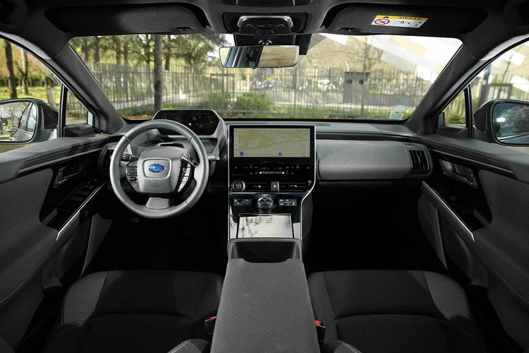 À l’intérieur, le Subaru Solterra fait beaucoup moins d’efforts, que ce soit pour cultiver sa différence ou sur la présentation générale. Parfaitement identique à celui d’un bZ4X, il en reprend donc les assemblages rigoureux, mais aussi l’ambiance terriblement datée, avec des plastiques durs et fragiles qui auront bien du mal à vieillir correctement. Seuls les écrans apportent une touche de modernité avec l’instrumentation numérique matte toujours lisible en cas d’ensoleillement, ou du large écran tactile central. Mais comme chez Toyota, ce dernier n’affiche aucune fantaisie dans ses fonctions et ne propose pas de GPS avec planificateur d’autonomie.