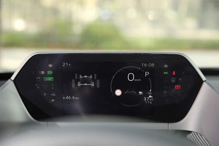 Le Subaru Solterra propose un mode de conduite Éco qui ne bride pas la puissance maximale à l’accélération, mais modifie la consistance de l’accélérateur. La climatisation dispose de son côté d’un mode Éco sélectionnable depuis le panneau. En revanche, le SUV dispose d’utiles palettes derrière le volant pour renforcer le freinage régénératif. Reste que la force de décélération n’est jamais trop forte passant d’un pic de -0,3 kW au premier niveau à -38 kW au quatrième et dernier cran dès 80 km/h sur du plat. Pour mettre en perspective, le système passe à -80 kW en ayant recourt au système dissipatif. En conduisant avec une plume sous le pied sur notre parcours routier, et en claquant sans relâche les palettes (le bruit de plastique n’est guère valorisant), on a passé la ligne d’arrivée avec une conso’ 11,0 kWh/100 km. Une belle moyenne qui représente une autonomie théorique de 580 km, ou de 535 km en prenant en compte ce qu’offre la jauge.