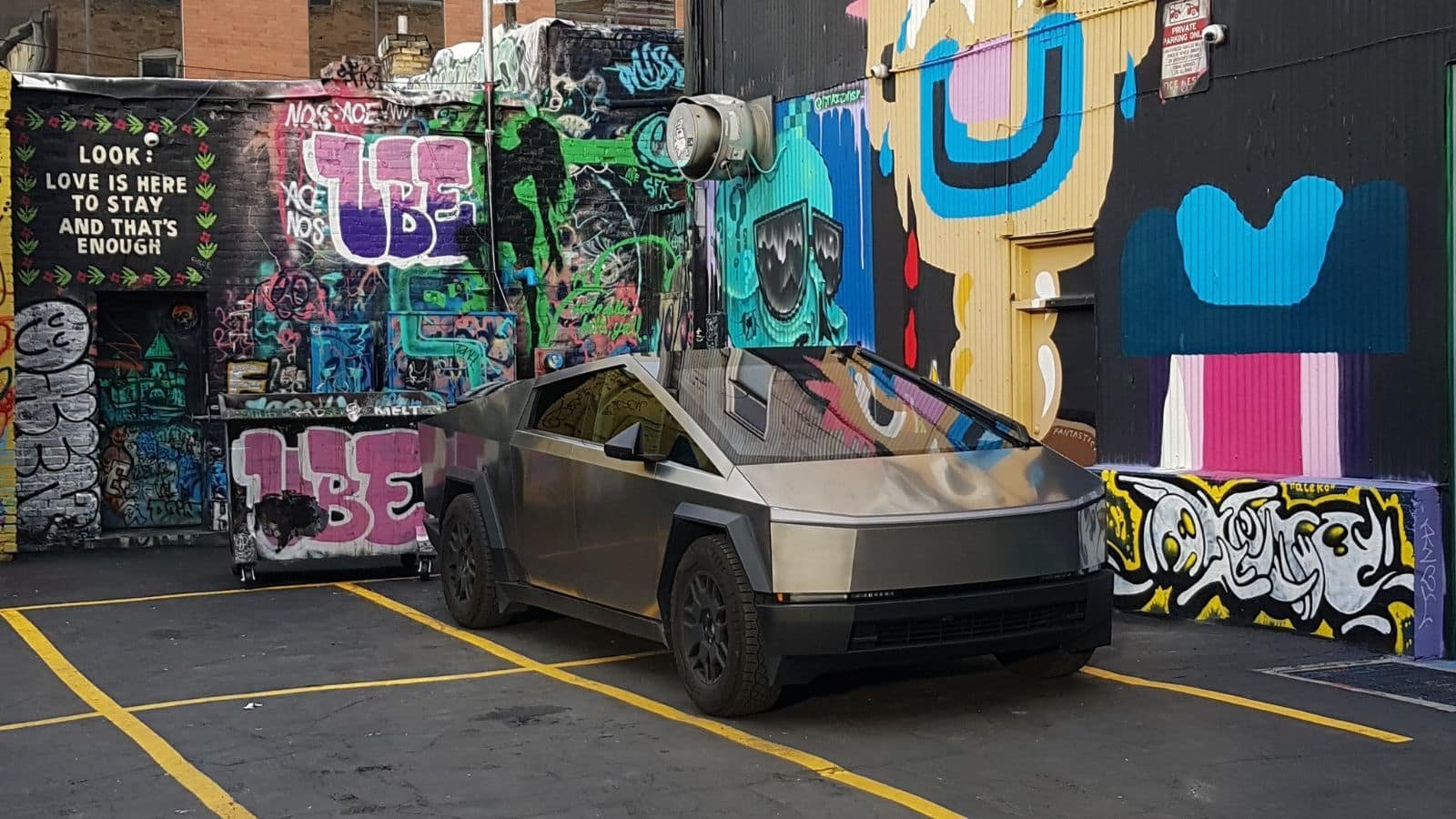Notre monture nous attend sur un parking bondé. Heureusement, il est reconnaissable au premier coup d’œil. Pas forcément à cause de son gabarit, finalement assez peu imposant face à la plupart des pick-up made in USA, mais par son look unique. Et nous ne parlons pas juste ici de l’absence totale de courbes dans son dessin, mais du défaut pur et simple d’une peinture ou d’un quelconque apprêt sur sa carrosserie en acier inoxydable. En grossissant un peu le trait, on pourrait dire que la peau de ce Tesla est faite de la même matière que les casseroles de votre grand-mère.