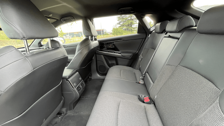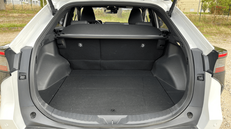 Prise en main – Toyota C-HR 2024 : que vaut le SUV compact devenu hybride rechargeable ?L’habitabilité est comparable à celle du Lexus RZ avec un bel espace aux jambes aux places arrière et une garde au toit suffisante. La banquette proche du plancher impose cependant une position assez repliée et la largeur aux coudes se montre un peu juste pour caser trois adultes à l’arrière. Côté coffre, le Toyota bZ4X revendique 452 litres, soit 70 litres de moins que son grand frère. Un volume assez moyen dû à une hauteur restreinte. La bonne largeur derrière les passages de roue et le grand hayon électrique facilite toutefois le chargement des bagages. Le double-fond ne permet que de loger un kit anti-crevaison et aucun rangement n’est disponible sous le capot avant. Il faudra donc prévoir de la place pour un sac de câble en plus des valises.