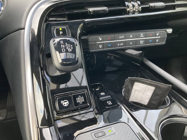 Le sélecteur de marche épouse la forme d’un petit levier qui tombe bien sous la main, proposant un ralentissement régénératif accentué (position Brake). En dessous de lui, un bouton sert à modifier le mode de conduite entre Eco, Normal et Sport. La présence d’une clé mains libres ne libère pas le conducteur de l’appui sur un bouton Power pour démarrer la Toyota Mirai.