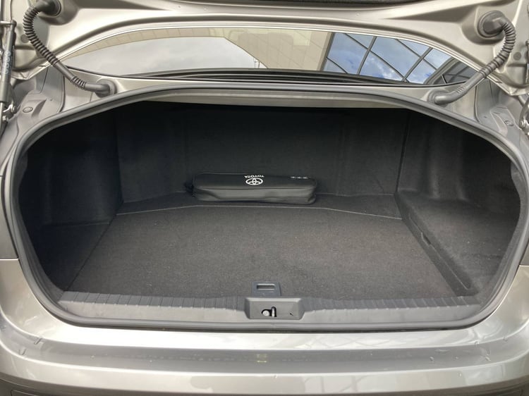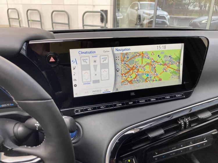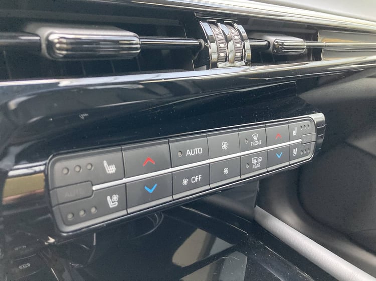 Comme pour trouver une meilleure exploitation de cette place, Toyota a aménagé son accoudoir central avec un porte-gobelet, une trappe de rangement, et une console permettant de commander différents équipements. Ainsi l’ambiance sonore, mais aussi les sièges chauffants et ventilés. Avec 3 personnes assises sur la banquette, ce boîtier sera très difficilement accessible.