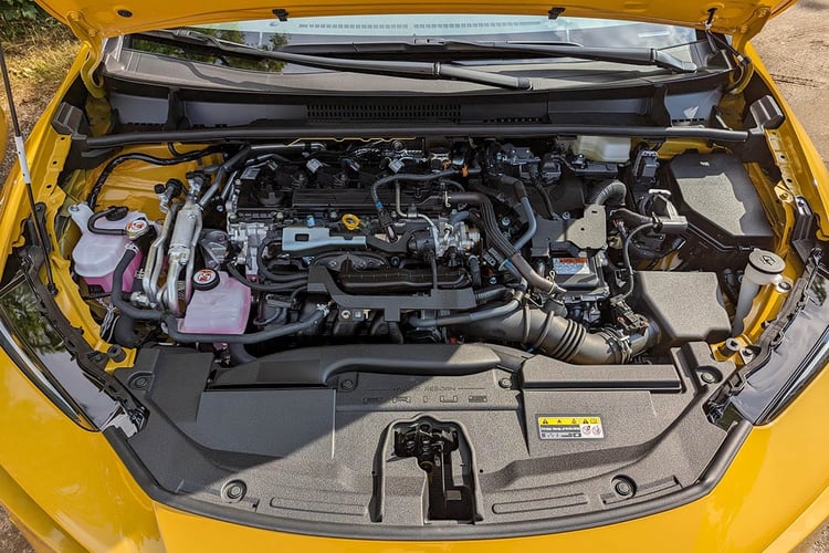 C’est le principe même de toutes les voitures hybrides rechargeables, mais la philosophie diffère ici. Et c’est notamment le cas en matière de gestion de la chaîne de traction, où la voiture fonctionne comme un gros système HSD avec ses modes hybrides par défaut, tout en offrant bien plus d’autonomie que les autres déclinaisons. Une sorte de HEV+, ou de h+ pour reprendre la dénomination de Lexus pour ses PHEV. On retrouve sous le capot le 4-cylindres M20A-FXS de la famille Dynamic Force, d’une puissance de 152 ch pour 190 Nm de couple. Toujours atmosphérique et fonctionnant sous un cycle Atkinson (gage d’efficience plutôt que de performances), il s’associe à une machine électrique de 163 ch pour 208 Nm de couple. L’ensemble propose une puissance combinée de 223 ch, toujours transmise aux roues avant via la transmission e-CVT à train planétaire.