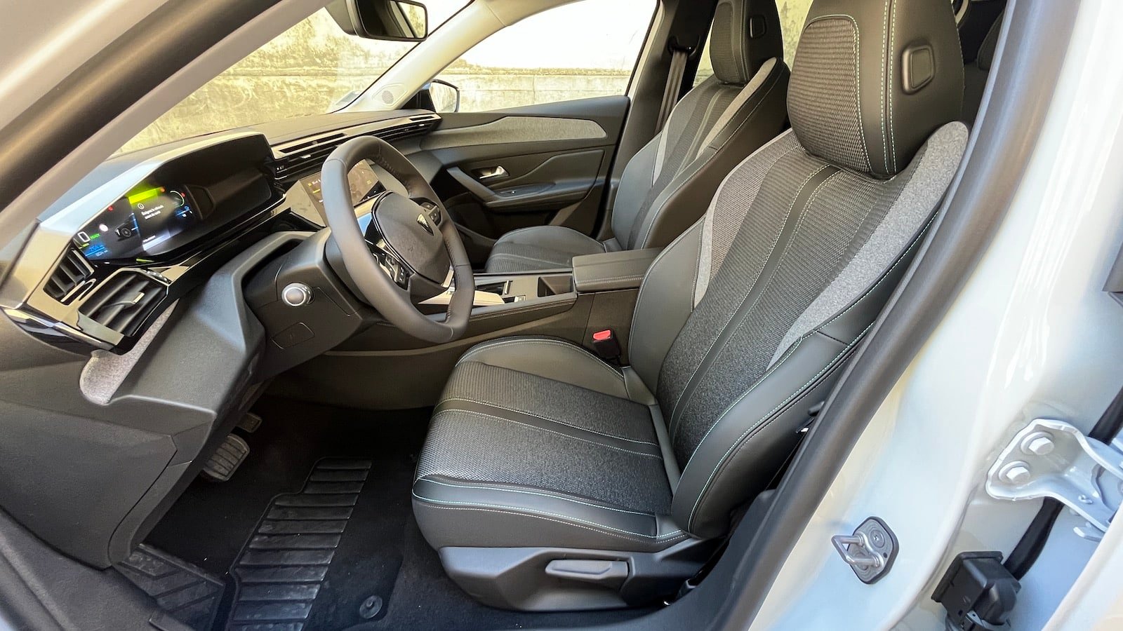 A bord, l’ambiance est moderne et chaleureuse. Le mobilier se compose essentiellement de plastiques bien rembourrés avec une sellerie très confortable parée de surpiqures très qualitatives. Si les réglages restent manuels sur cette version Allure, ils s’effectuent rapidement et le passager bénéficie lui aussi d’un ajustement en hauteur de son assise. Dans cette déclinaison électrique, la Peugeot e308 intègre de série des sièges et un volant chauffant. La Peugeot e308 s’illustre aussi par ses nombreux rangements avec de larges bacs de contre porte et une immense boîte à gants. Seul bémol, le chargeur à induction mal placé et peu efficace. Nul besoin dès lors d’opter pour cette option à 350 €.