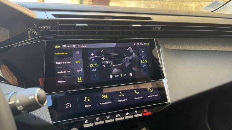 Vidéo – Peugeot e-3008 : tout ce qu’il faut savoir sur le 3008 électrique à l’autonomie recordCôté multimédia, la Peugeot e308 souffle le chaud et le froid. L’écran numérique est parfaitement intégré à la planche de bord et l’ergonomie de toutes les commandes très bien pensées. Les réglages de climatisation sont intuitifs comme la disposition de tous les menus. La connectivité sans fil pour obtenir Apple Carplay est aussi très appréciable et très fiable. Notons également que l’autoradio de série propose une bonne qualité sonore. L’instrumentation numérique colorée mérite aussi des louanges avec un affichage très lisibles même en plein soleil qui présente le niveau d’autonomie à la fois en kilomètres et en pourcentage.