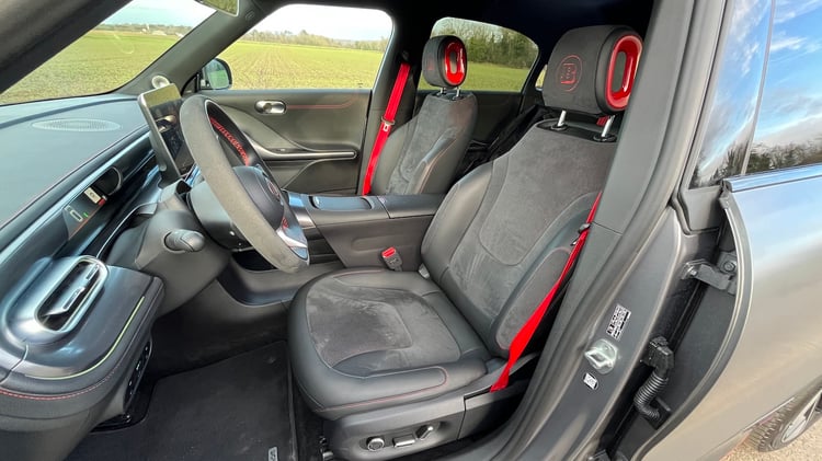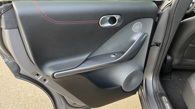 L’accès à bord de notre Smart #1 Brabus en robe gris atome mat s’effectue au moyen des poignées escamotables qui rappellent la marque de la voiture électrique. Un soin particulier a été apporté à l’ambiance intérieure lumineuse. Les passagers assis à l’avant disposent d’un chargeur induction pour smartphone, de prises (12 V et USB-C) et de nombreux espaces de rangements, notamment avec la console à 2 niveaux et les 2 porte-gobelets sous trappe. En revanche, juste derrière, celle qui masque une petite soute et sert d’accoudoir, s’ouvre par un bouton assez mal placé. Elle a tendance à se libérer malencontreusement si on pose le bras dessus.