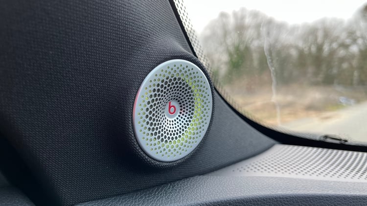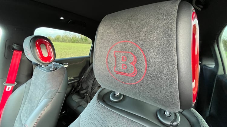 La patte du préparateur allemand se retrouve sur le bouclier avant spécifique, et en logo à différents endroits de la carrosserie dont au bas des portes arrière, ainsi que sur le volant. Réglable en hauteur et en profondeur, ce dernier supporte des boutons très faciles à utiliser en conduisant, avec à gauche ceux réservés aux aides à la conduite, et, de l’autre côté, ceux pour intervenir sur l’ordinateur de bord et le système d’infodivertissement. Tout comme le dessus légèrement rembourré de la planche de bord, il est enjolivé avec des surpiqûres rouges.