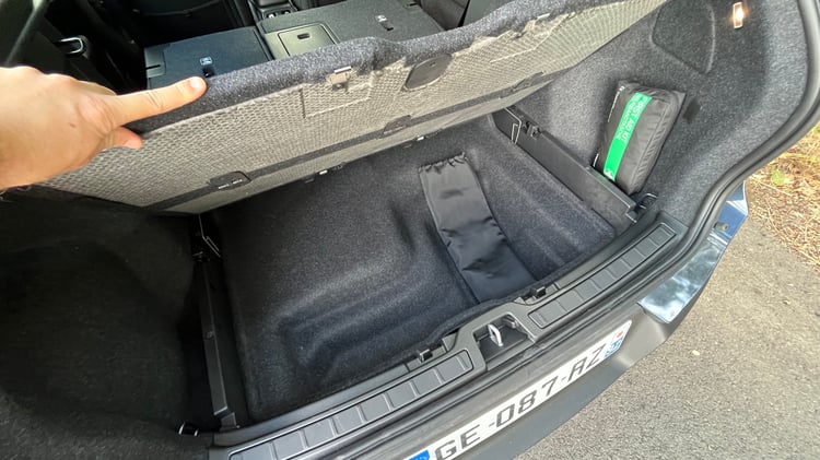 Déjà au niveau du coffre de 452 litres très accessible avec un seuil de charge relativement bas et bien découpé. Le volume peut être étendu à 1 527 l en rabattant le dossier en 2 parties, avec trappe à skis, de la banquette. Le plancher est alors parfaitement plat, avec un double fond pour loger plus que les câbles de recharge. Mais ces derniers pourront aussi être isolés dans le frunk couvert de 31 l sous le capot.
