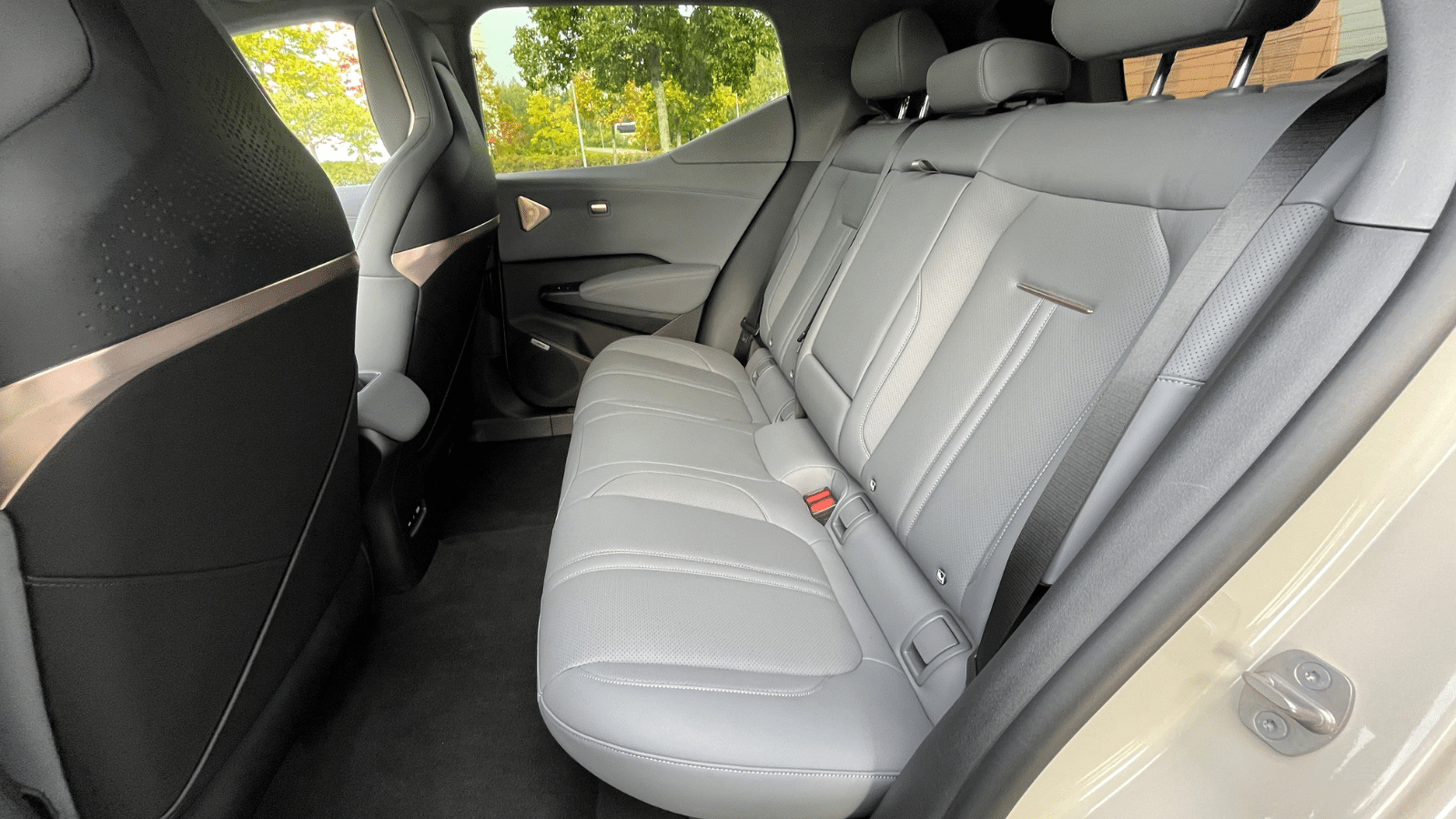 Les places arrière offre un bel espace aux jambes et une garde au toit suffisante pour des adultes de taille moyenne. Le tunnel central minuscule ne pénalisera pas un troisième passager au milieu. Les portières hautes, les imposants montants arrière et les vitrages teintés génèrent une atmosphère très confinée malgré la présence du grand toit vitré. Les bacs de portes sont minuscules, mais on trouve de belles aumônières, deux prises (USB et USB-C) et des buses de ventilations de chaque côté.
