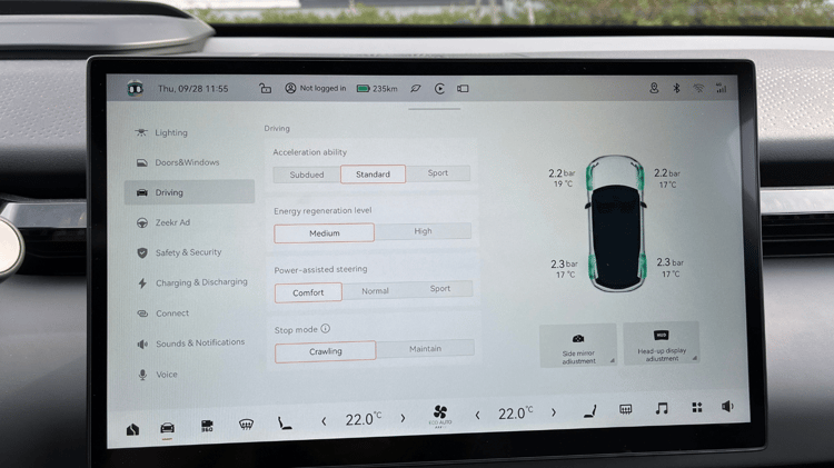 Sur voie rapide, la Zeekr X procure toujours un excellent niveau de confort grâce à une bonne insonorisation. Sur les routes suédoises au revêtement assez granuleux, des bruits de roulement se faisaient entendre, mais les sifflements d’air sont bien contenus malgré l’absence de double vitrage et la chaine Hifi Yamaha vous plonge dans un studio d’enregistrement. Comme lors de la présentation du Lotus Eletre, notre Zeekr X d’essai n’avait pas le calibrage définitif de ses aides à la conduite (ADAS). Le régulateur actif fonctionnait bien, mais l’aide au maintien de voie (qui figurera sur les versions commercialisées) n’étaient pas encore disponibles. Pour répondre aux futures normes de sécurité, la Zeekr X est bardée d’avertisseurs sonores extrêmement pénibles, notamment pour les dépassements de vitesse (lié à la lecture des panneaux qui n’est pas toujours fiable) ou la perte de vigilance du conducteur avec reconnaissance faciale (Big Brother is watching you). Mais il va falloir absolument que les constructeurs trouvent un moyen de les déconnecter le plus rapidement possible tout en respectant les nouvelles normes de sécurité très sévères qui les imposent à chaque démarrage.