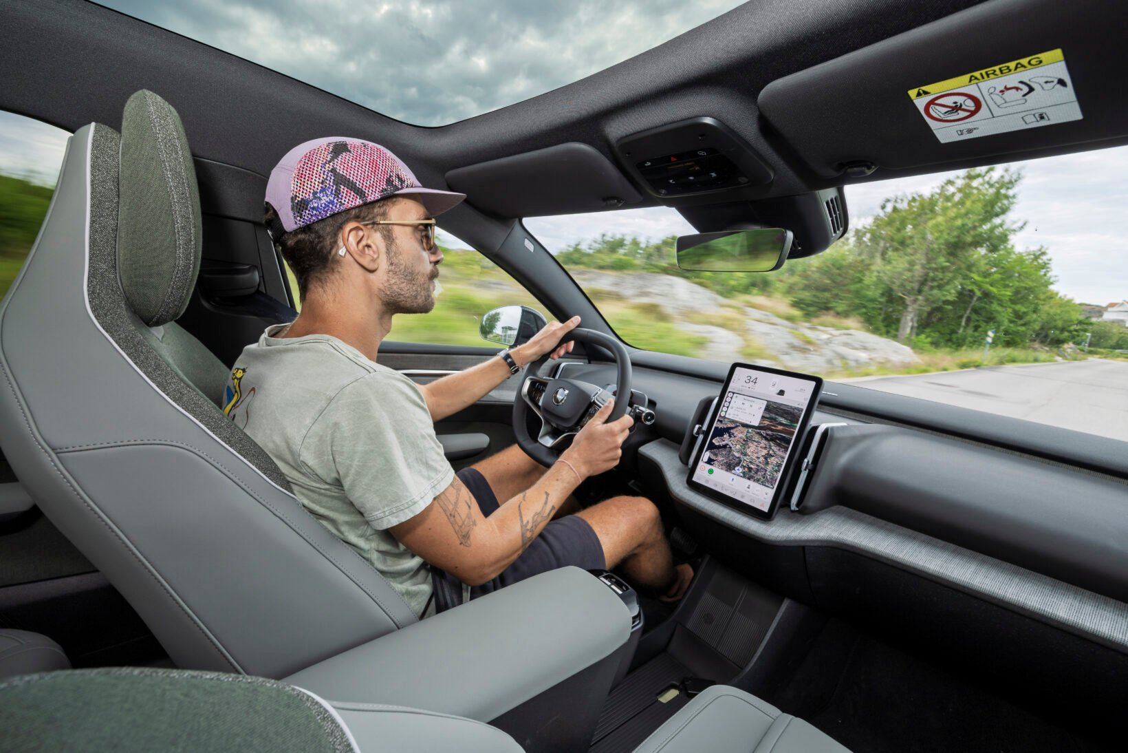 Au volant, on prend beaucoup de plaisir à rouler avec ce petit engin. La tenue de route est bonne dans les virages, c’est réactif et les freins répondent bien. Notre boucle de 75 km nous permet de découvrir les paysages de la côte ouest suédoise et de constater une consommation assez élevée pour le petit SUV électrique suréquipé. On arrive à 18,4 kWh/100 km au bout du parcours. En fouillant un peu dans les paramètres du véhicule, on constate une moyenne de 22 kWh/100 km sur les 1 240 derniers km parcourus.