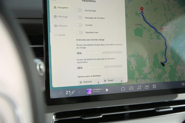 Toujours à l’avant, on remarque l’apparition de nouveaux commodos plus originaux et plus agréables à manipuler, même si la transition pour activer les aides à la conduite avec la tige de droite pourrait être mieux marquée. Enfin, les deux écrans sont dorénavant détachés du tableau de bord. L’instrumentation affiche toujours les mêmes informations et la dalle centrale conserve sa présentation et ses menus qui semblent hérités d’une Tesla. Enfin prend place au centre un nouveau bloc équipé du double chargeur à induction et du double porte-gobelet. Le premier, très puissant, peine toutefois à maintenir les téléphone en raison d’un revêtement glissant. Même chose pour le volant, intenable à 9 h 15, qui mériterait d’être habillé d’un revêtement plus accrocheur.