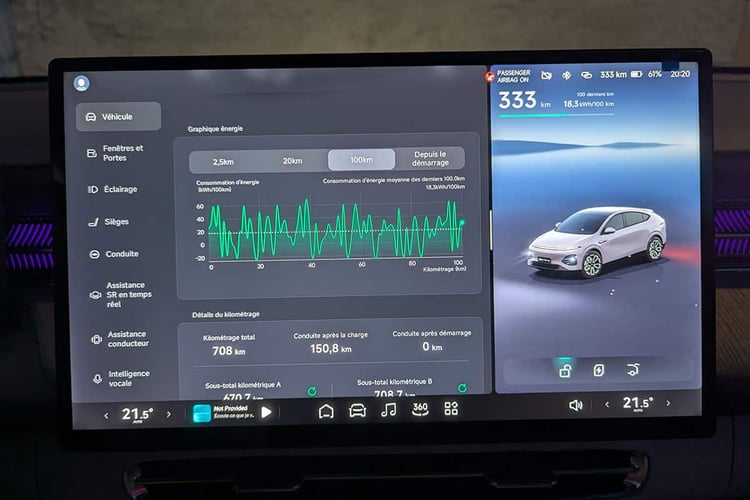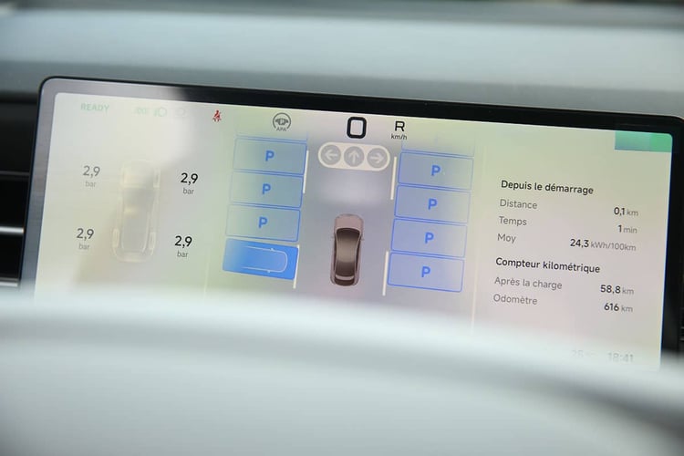 Sur la route, les prestations de ce nouveau XPeng G6 sont parfaitement identiques à la première mouture. On y retrouve un SUV au gabarit costaud pour la ville, dont il est possible d’appréhender les dimensions grâce à la caméra à 360° braquée sur les jantes exposées. Notons que le SUV affiche un rayon de braquage assez important mais inférieur à un Tesla Model Y, et la fonction de parking automatique est plutôt pertinente.