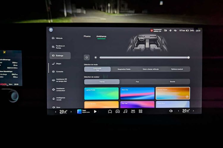 La nouvelle mouture du SUV chinois embarque un éclairage d’ambiance qui peut être fixe ou animé en fonction d’un programme prédéfini ou au rythme de la musique. L’éclairage apporte de la chaleur et un peu de clarté à bord, même si la sellerie blanche participe déjà à cet effet. Une jauge permet de régler la luminosité et un bouton permet de tout éteindre. Dommage, cela se fait dans les deux cas sans distinction entre l’avant et l’arrière et cela coupe l’éclairage du rangement inférieur où se situent les ports USB. Côté écrans, deux jauges permettent de régler la luminosité des dalles. Mais on y retrouve un mode Auto, tout comme pour la permutation mode jour/nuit.