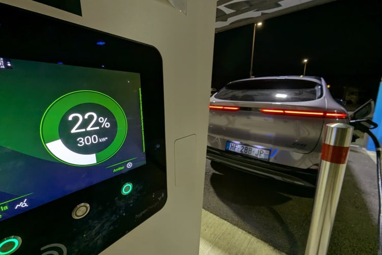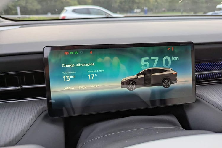Toutes ces considérations volent toutefois en éclat au moment de raccorder le XPeng G6 sur les bornes de recharge rapide : c’est tout simplement l’électrique la plus rapide à se ravitailler ! Si nous n’avons jamais pu dépasser les 380 kW de puissance, le SUV parvient tout de même à réaliser le 10-80 % en 12 ou 13 minutes sur des bornes courantes. Avantage inattendu : son comportement chatouilleux lui permet d’aller plus vite sur des bornes de 300 kW majoritaires sur l’autoroute, que sur de plus rares bornes de 400 kW ! Il peut ainsi récupérer 265 km d’autonomie autoroutière en 15 minutes. La puissance moyenne de 302 kW qui en découle est la meilleure de notre base de données. Enfin, le plein à 100 % n’excède pas les 30 minutes. Dès lors, c’est l’un des plus rapides pour voyager via l’autoroute ! En revanche, les Superchargeurs Tesla sont à oublier : une incompatibilité rend la recharge impossible (pour le moment ?). Sur les bornes en courant alternatif, il peut faire confiance à son chargeur embarqué de 11 kW en série (10-100 % en 9 h).